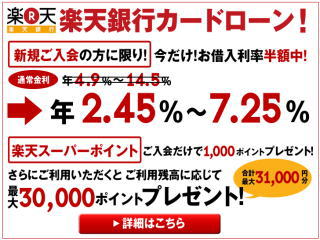 楽天銀行が発行する個人向けカードローンです。ネットで契約を完了でき、面倒な郵送のやり取りも不要。また限度額100万円以下の場合、収入証明書が原則不要です。